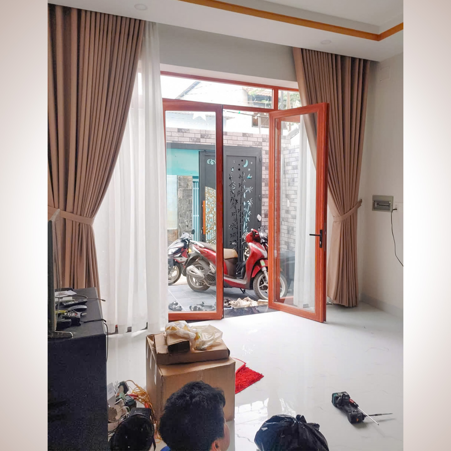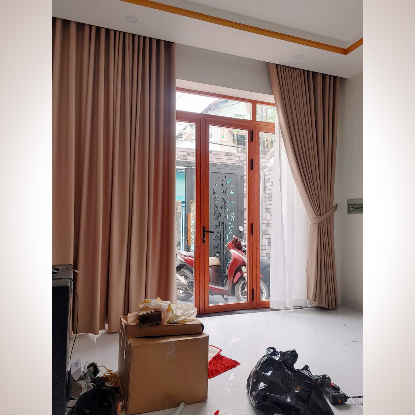 Với những bộ rèm cửa chính có chiều cao thông tầng ấn tượng, đội ngũ kỹ thuật của Thiên Kim đã thực hiện lắp đặt vô cùng tỉ mỉ. Chúng tôi chú trọng gia cố thanh ray âm trần chắc chắn, đảm bảo rèm vận hành êm ái, nhẹ nhàng dù bộ rèm có kích thước lớn và trọng lượng nặng.