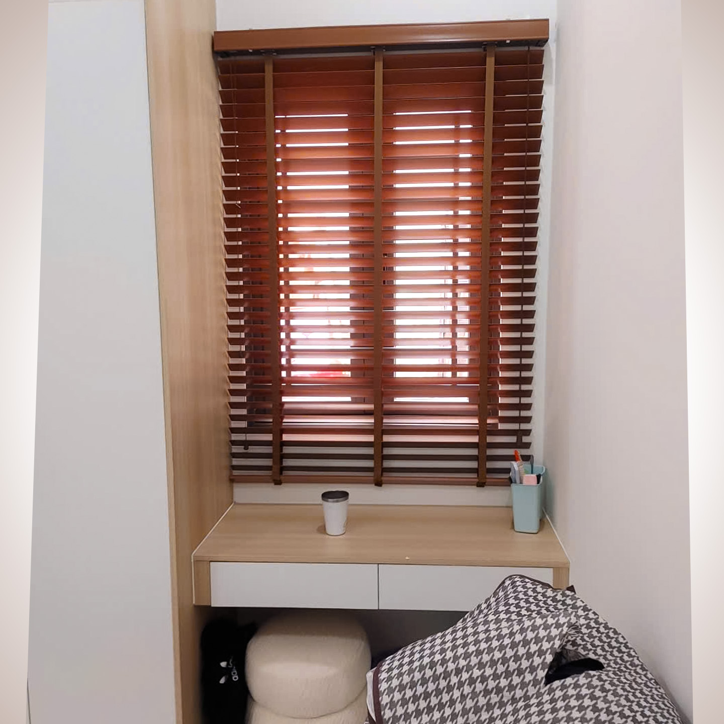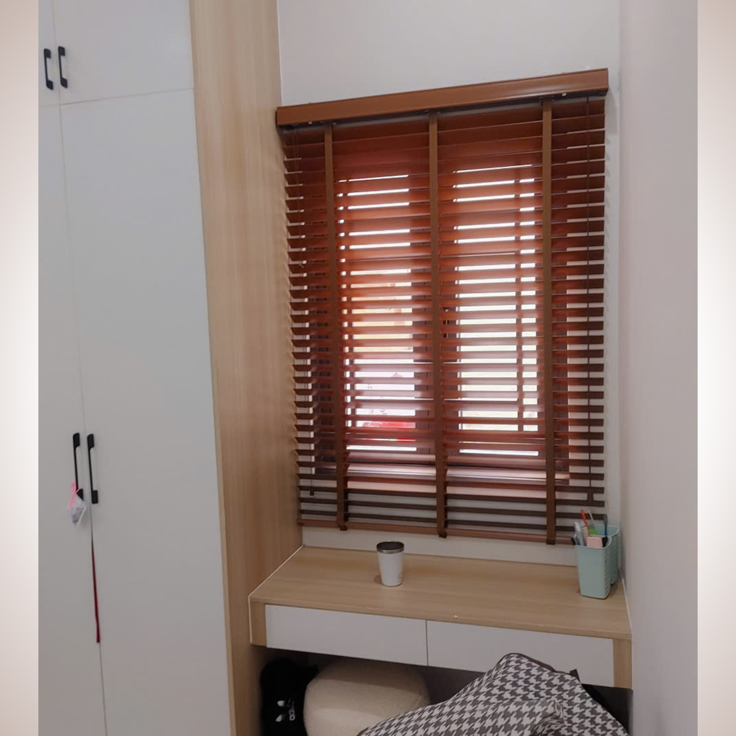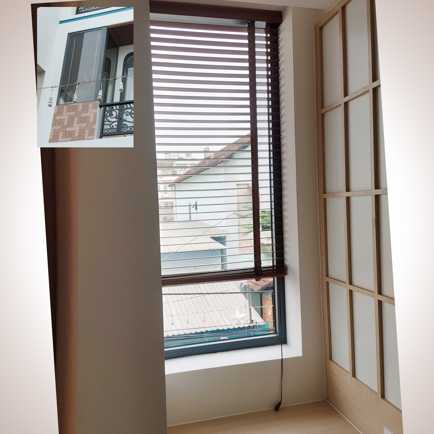 Tại các ô cửa sổ và đặc biệt là góc kính chữ L, Thiên Kim đã khéo léo lắp đặt hệ thống rèm sáo gỗ cao cấp.