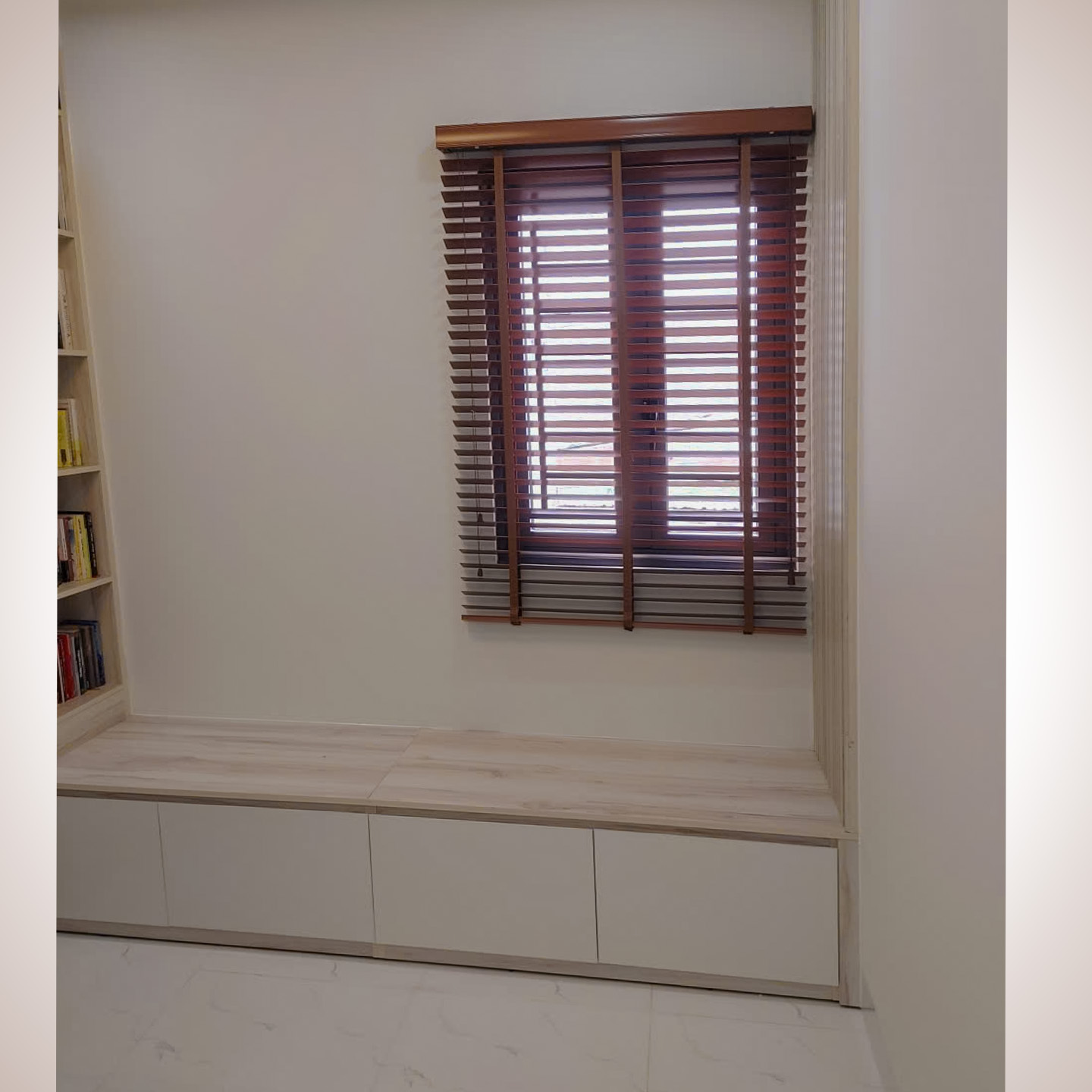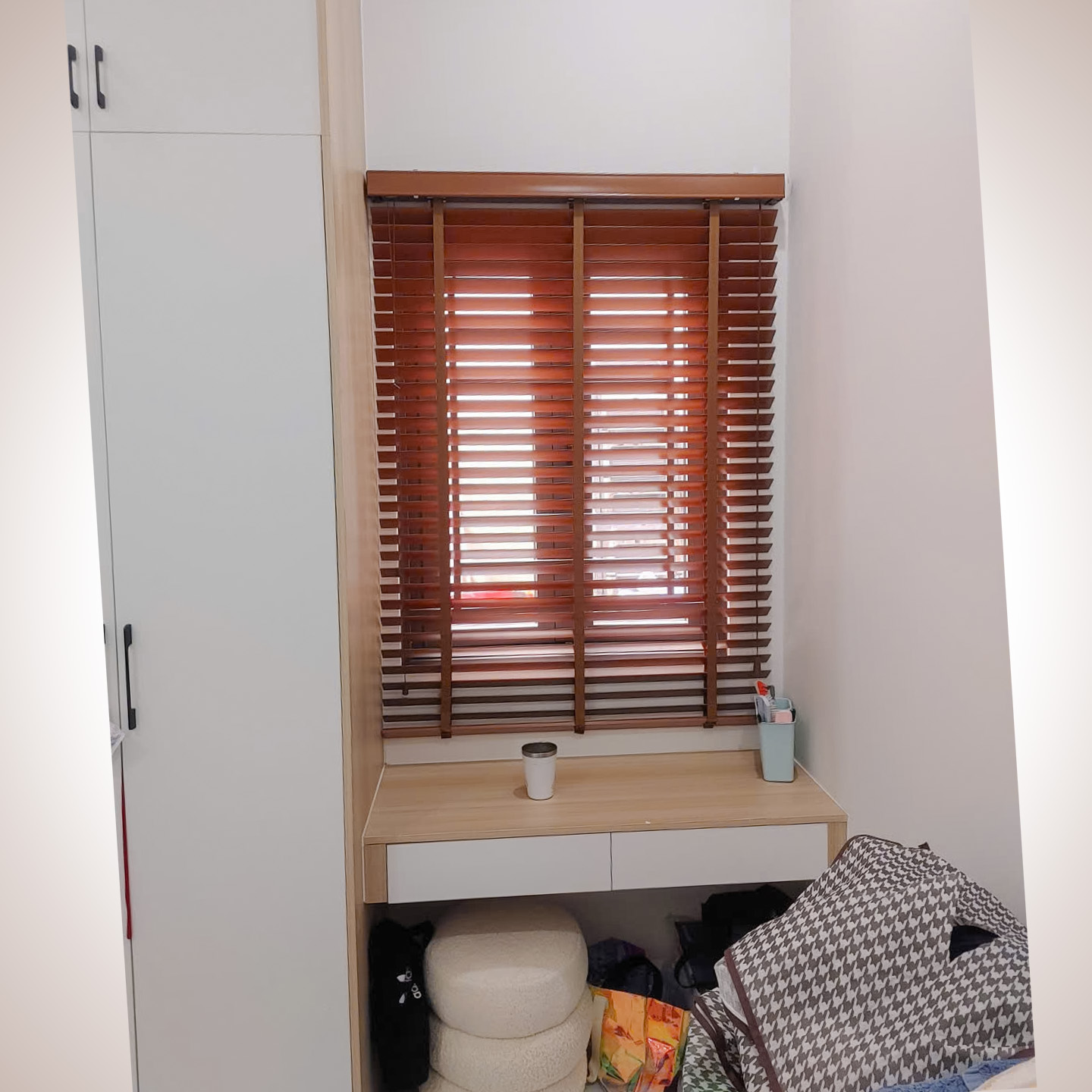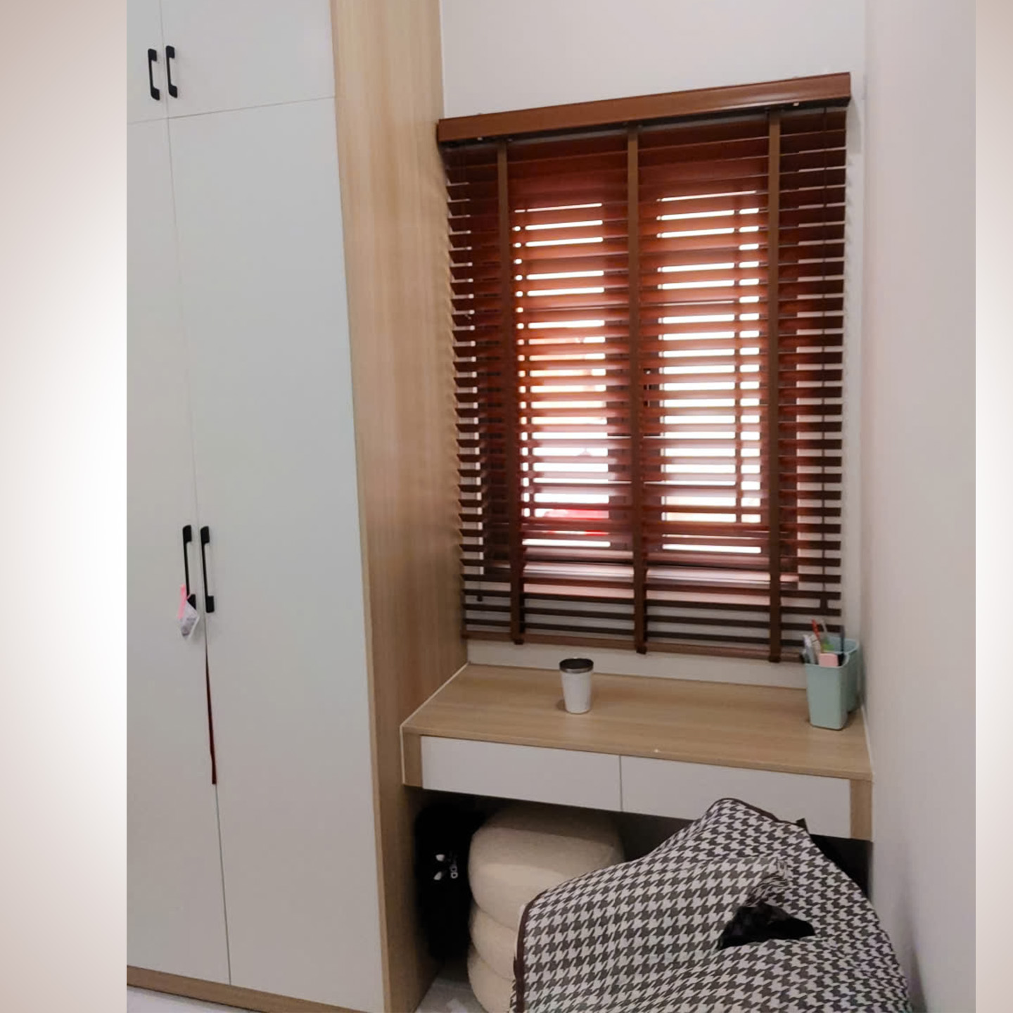 Tại các ô cửa sổ và đặc biệt là góc kính chữ L, Thiên Kim đã khéo léo lắp đặt hệ thống rèm sáo gỗ cao cấp.