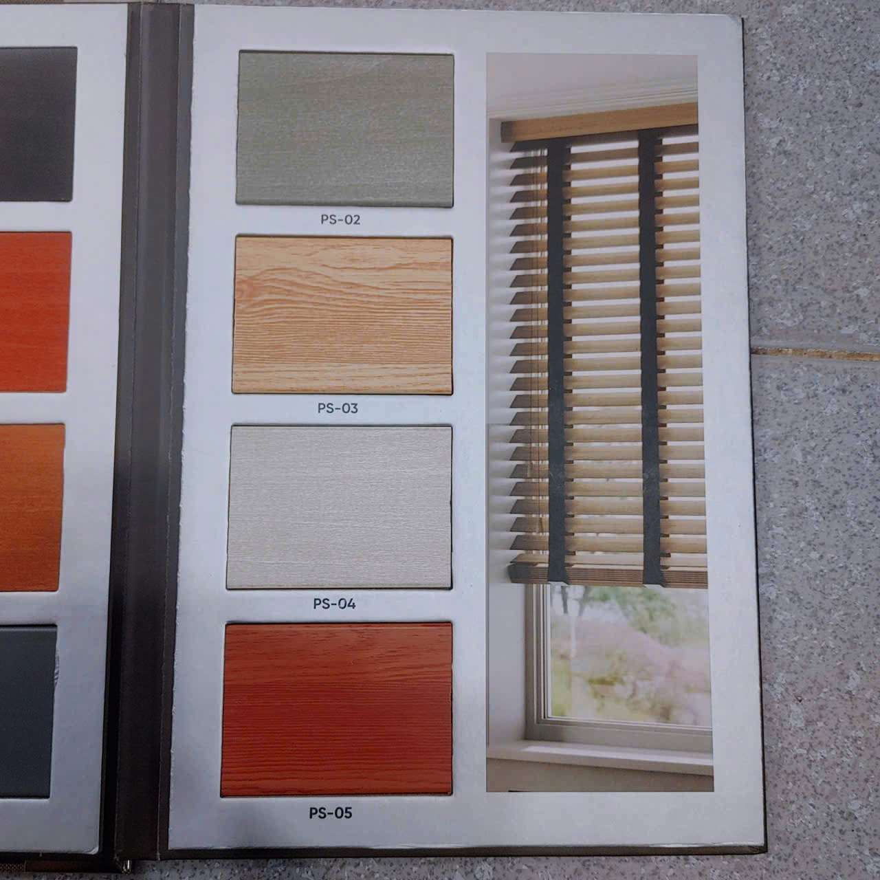 - Đặc điểm: Dành cho những ai yêu thích vẻ đẹp của gỗ nhưng mong muốn giải pháp bền bỉ hơn trong môi trường ẩm ướt hoặc chi phí tiết kiệm hơn. Các mã sản phẩm PS (ví dụ: PS-01 đến PS-05) mô phỏng chân thực vân gỗ với nhiều tông màu hiện đại như xám nhạt, vàng nhạt, trắng kem hay cam đất. Rèm nhựa giả gỗ, rèm gỗ chống nắng.